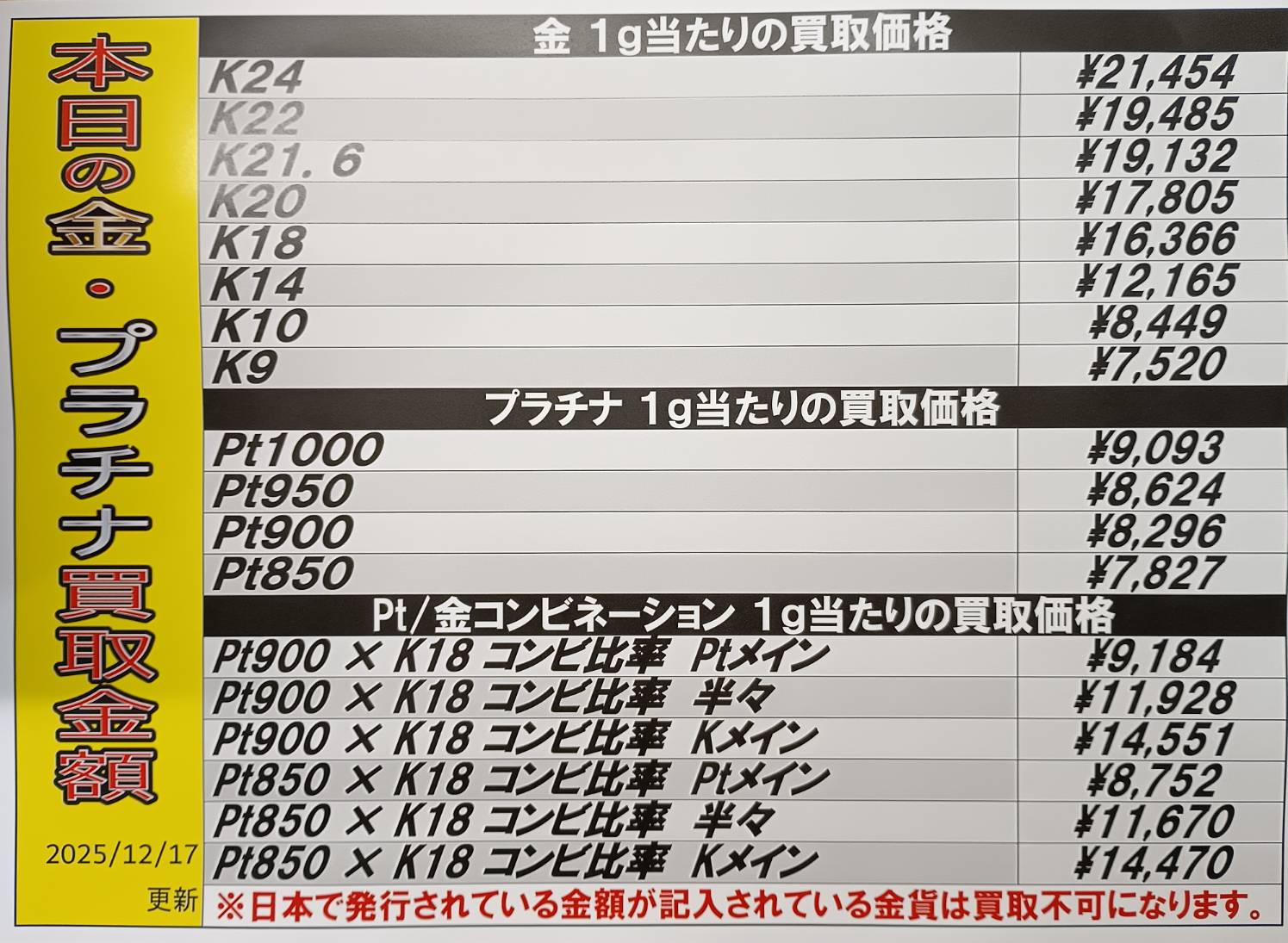 【鹿児島店】換金・酒・携帯他 買取情報 《金・プラチナ》 買取・入荷情報 新着情報 鹿児島店 お酒 家電/雑貨 貴金属/換金 その他 2025年12月17日 【鹿児島店 換金・酒・携帯他 買取情報】 金・プラチナ買取価格です。 相場状況により変動しますのでご了承下さい。 ******************** ★〖換金〗買取・入荷記事は👉こちら★