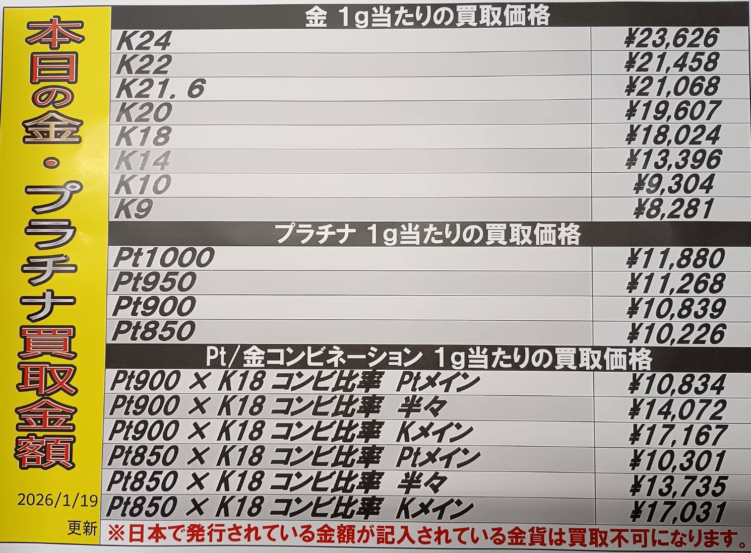 【鹿児島店】金・プラチナ買取価格です!■ 買取・入荷情報 新着情報 鹿児島店 貴金属/換金 2026年1月19日 【鹿児島店 換金 買取情報】 金・プラチナ買取価格です! 相場状況により変動しますのでご了承下さい。 ※2026/1/19 現在の価格となります。 ******************** ★〖換金〗買取・入荷記事は👉こちら★