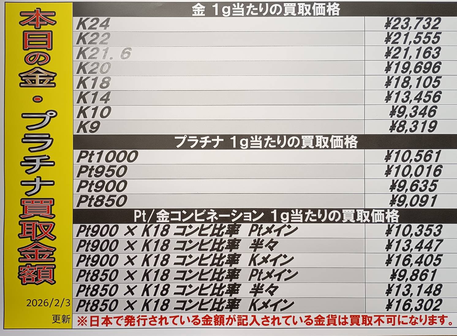 【鹿児島店】換金 買取情報 《金・プラチナ買取価格です。》 買取・入荷情報 新着情報 鹿児島店 貴金属/換金 2026年2月3日 【鹿児島店 換金 買取情報】 金・プラチナ買取価格です。相場状況により変動しますのでご了承下さい。 ※2026/2/3現在の価格となります。 在庫状況・状態によってお値段が変動いたします。予めご了承ください。 ******************** ★〖換金〗買取・入荷記事はこちら★