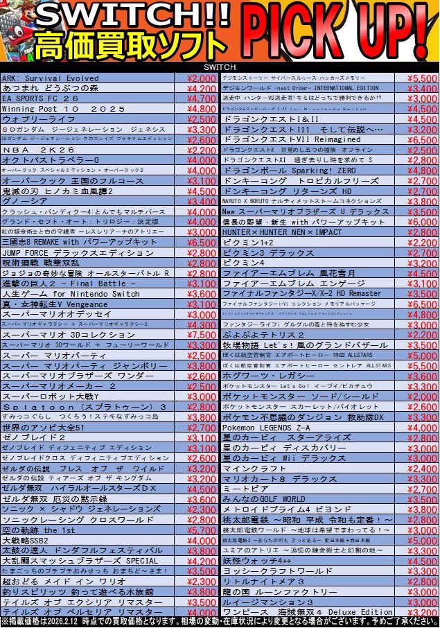 【鹿児島店】ゲーム 買取情報《買取価格更新しました❗️》 買取・入荷情報 新着情報 鹿児島店 ゲーム 2026年2月12日 【鹿児島店 ゲーム 買取情報】 買取価格更新しました❗️ Switch・Switch2ソフト🎮高価買取中です💰⤴️ 買取お持ち込みお待ちしております(*ˊᗜˋ)ノ゙ ******************** ★〖ゲーム〗最新買取表は👉こちら★