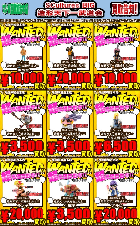 【加治木店】おもちゃ 買取情報《買取告知情報》 買取・入荷情報 新着情報 加治木店 NEW おもちゃ/ホビー 2026年2月25日 【加治木店 おもちゃ 買取情報】 ドラゴンボールシリーズの高価買取対象フィギュアを追加致しました!数量限定で高価買取致します!是非マンガ倉庫加治木店までお持ち込みください! ※各商品個数に制限がございます。予めご了承ください。 ※未開封の箱美品、完品のものが対象となります。箱にダメージがあるものなど減額になる可能性もありますのでご了承ください。 ※相場の大幅な変動により買取金額が前後する場合がございますのでご注意ください♪ ********************