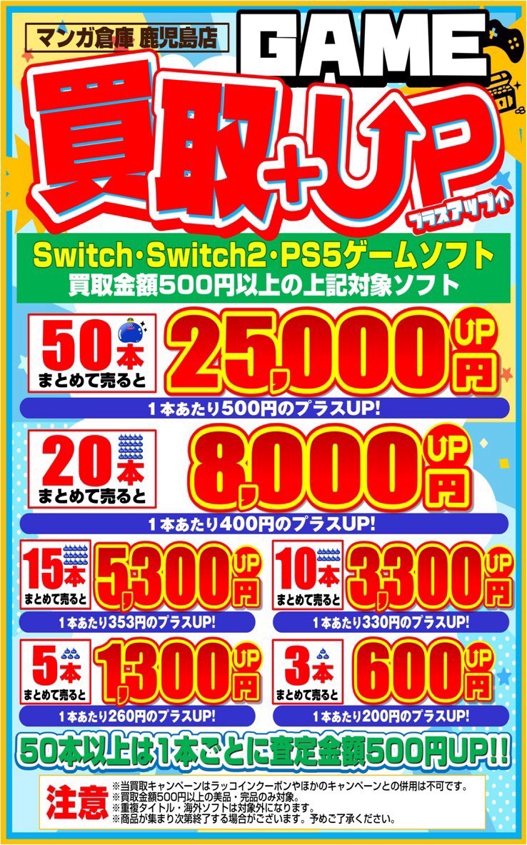 【鹿児島店】ゲーム 買取情報《ゲーム本体・ソフト》 買取・入荷情報 新着情報 ゲーム 2026年3月5日 【鹿児島店 ゲーム 買取情報】 ゲーム本体・ソフト買取しました❕ まだまだ買取お待ちしてます(*ˊᗜˋ)ノ゙ 買取プラスアップの内容が変更しました❗️ PS4ソフトが対象外となり、新たにSwitch2ソフトが対象に加わりますദ്ദി>ᴗ<) また20本50本のプラスアップも常時開催中となります(o´・ω-)b この機会に是非買取にお持ち込みくださいm(_ _)m ******************** ★〖ゲーム〗最新買取表は👉こちら★