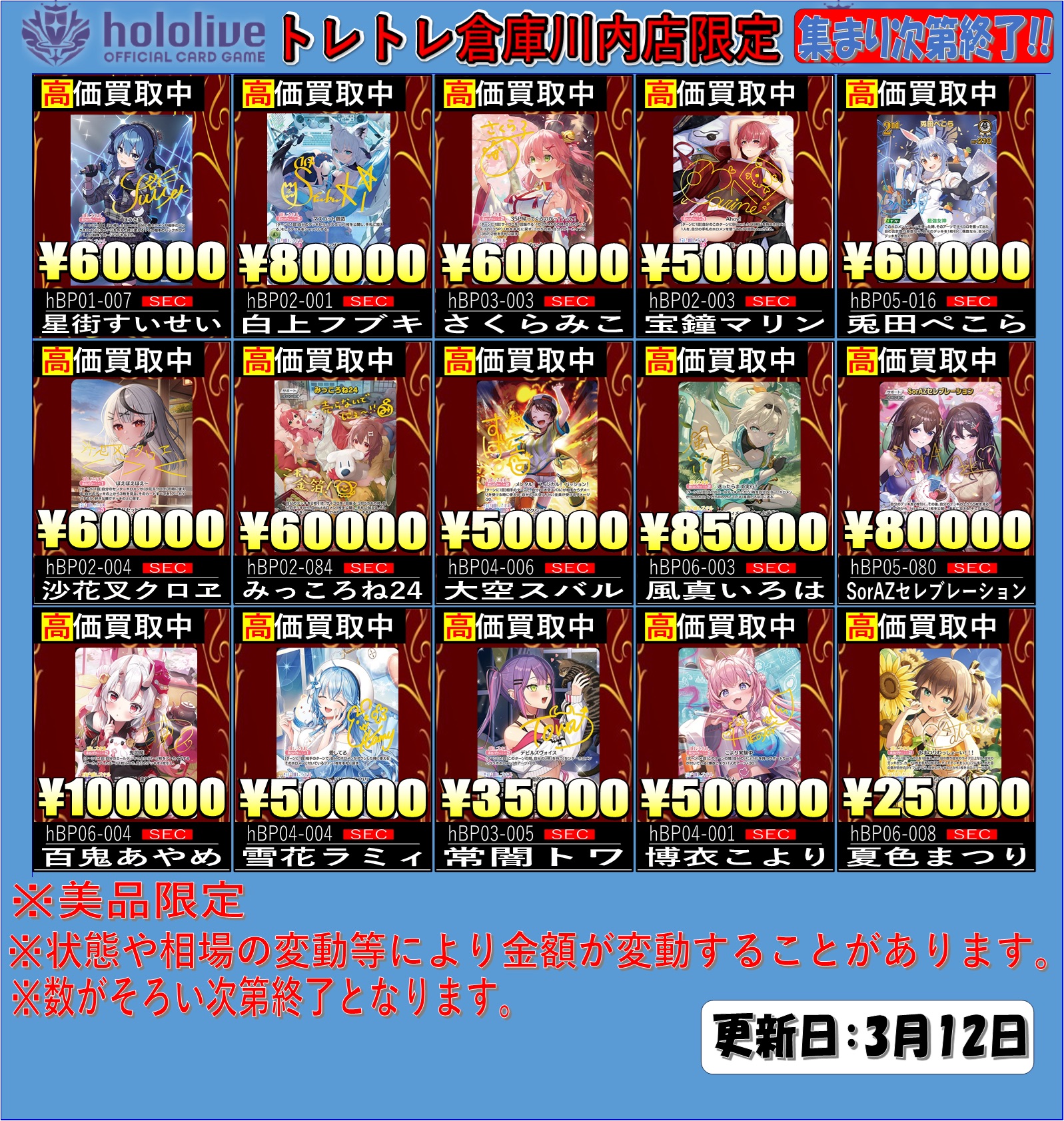 【トレトレ倉庫川内店】カード 買取情報《ホロライブカード》 買取・入荷情報 新着情報 トレトレ倉庫川内店 NEW カード 2026年3月12日 【トレトレ倉庫川内店 カード 買取情報】 ホロライブカード 買取情報‼️ ホロライブカードSEC高価買取価格更新しました‼ 是非、トレトレ倉庫川内店へお越しください♪ ⚠️注意事項⚠️ ①美品限定 ②数がそろい次第終了となります。 ③状態や相場の変動等により金額が変動することがあります。 ********************