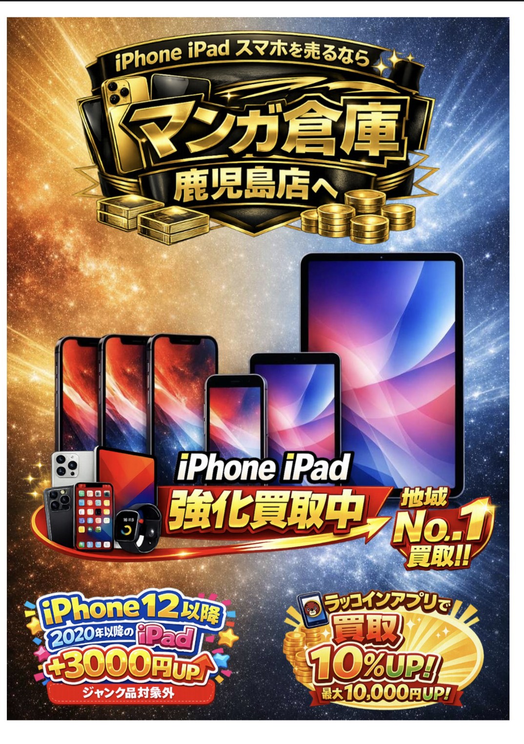 【鹿児島店】【11インチ M3 iPad Air Wi-Fi 128GB 中古品】【iPhone 15 256GB 中古品】買取させて頂きました♪ 買取・入荷情報 新着情報 鹿児島店 スマホ・タブレット 2026年3月15日 【鹿児島店 iPhone 買取情報】 11インチ M3 iPad Air Wi-Fi 128GB 中古品】【iPhone 15 256GB 中古品】を買取致しました!! マンガ倉庫鹿児島店では、当店指定のiPhone・iPadを通常買取価格+3000円アップキャンペーンを実施中です。 ******************** 最新買取情報はコチラをタップ👇