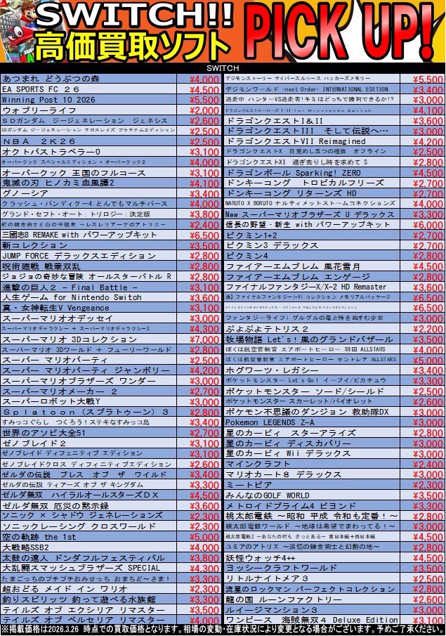 【鹿児島店】ゲーム 買取価格更新しました❗️ 買取・入荷情報 新着情報 鹿児島店 ゲーム 2026年3月26日 【鹿児島店 ゲーム 買取情報】 買取価格更新しました❗️ Switch・Switch2ソフト🎮高価買取中です💰⤴️ SWITCH2ソフト ●ぽこ あ ポケモン 買取7000円買取❗️ ●バイオハザードレクイエム 買取6000円買取❗️ 是非この機会にお持ち込み下さい🙇♂️ ※2026/3/26 現在の価格となります。 在庫状況などによってお値段が変動いたします。予めご了承ください。 画像 商品説明(あれば) ******************** ★〖ゲーム〗最新買取表は👉こちら★