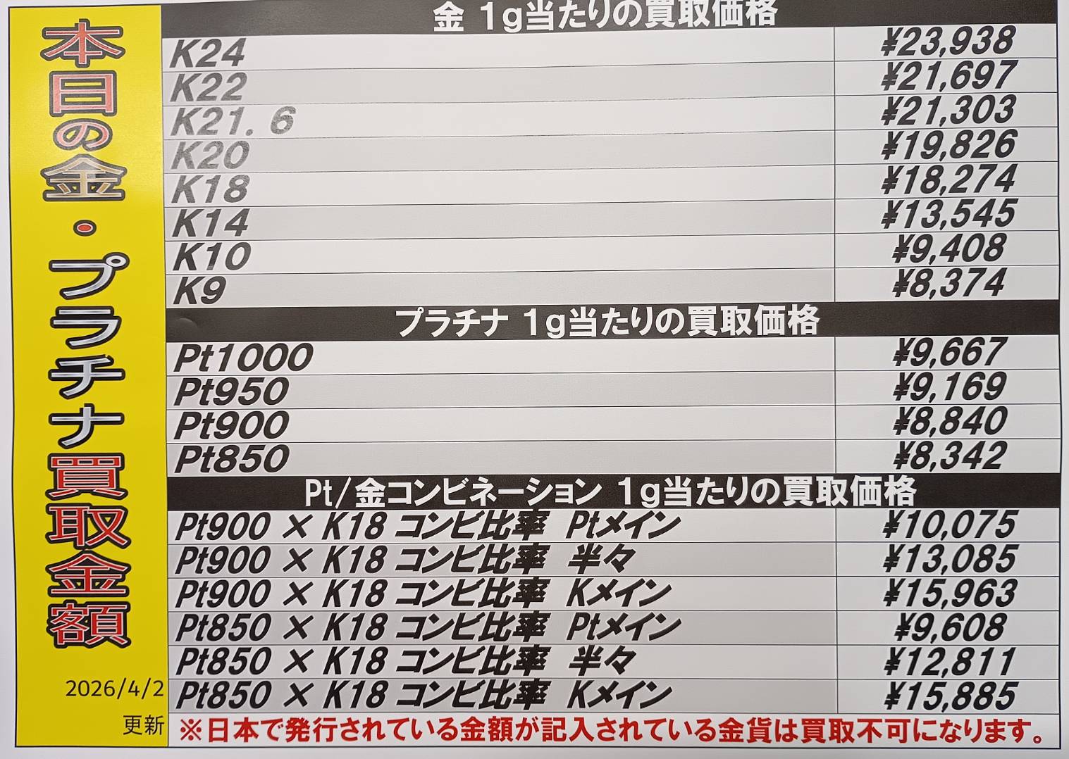 【鹿児島店】換金 買取情報 《金・プラチナ》 買取・入荷情報 新着情報 鹿児島店 貴金属/換金 2026年4月2日 【鹿児島店 換金 買取情報】 金・プラチナ買取価格です。 相場状況により変動しますのでご了承ください。 ※2026/4/2現在の価格となります。 在庫状況・状態によってお値段が変動いたします。予めご了承ください。 ******************** ★〖換金〗買取・入荷記事は👉こちら★