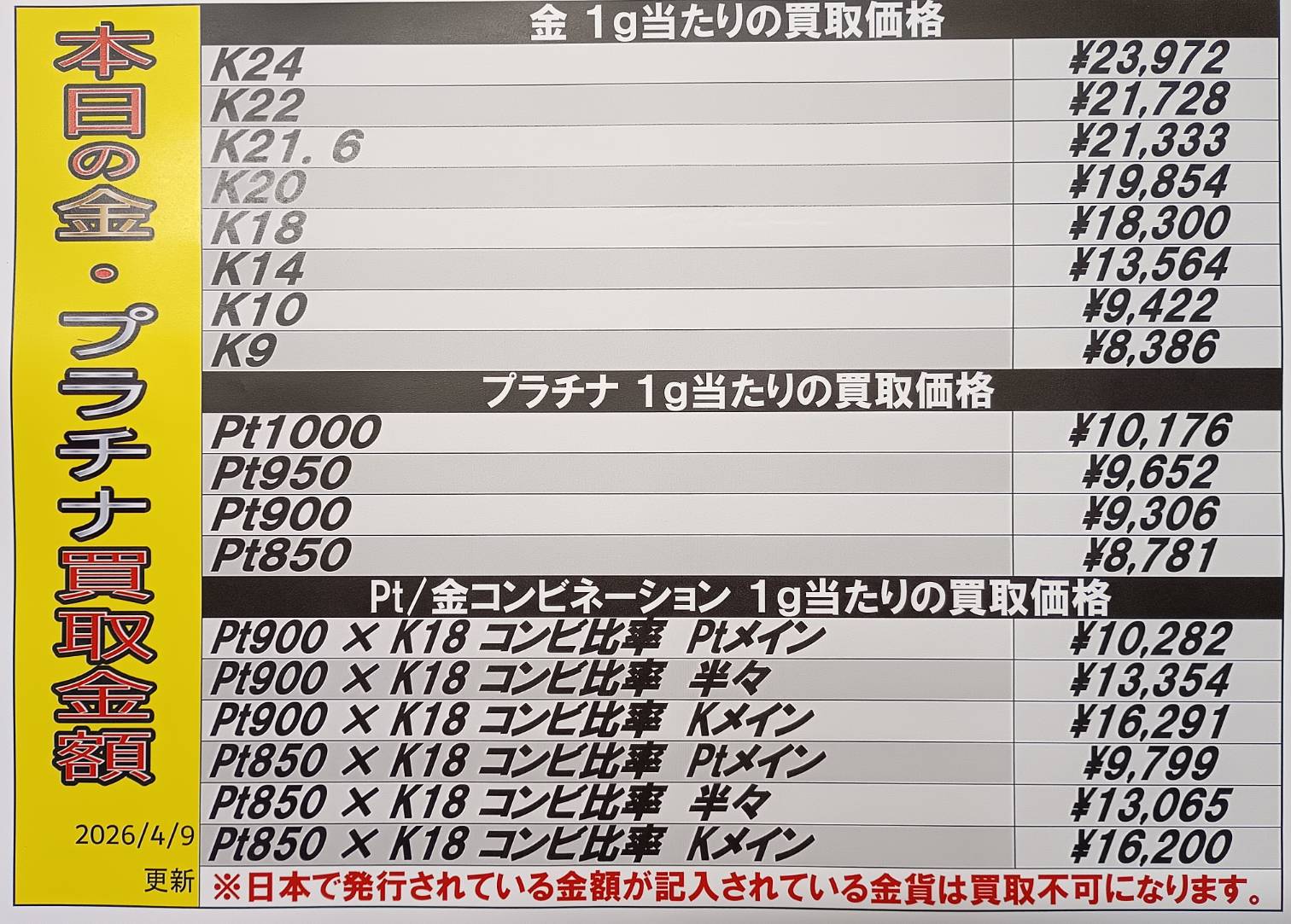 【鹿児島店】換金 買取情報 《金・プラチナ》 買取・入荷情報 新着情報 鹿児島店 貴金属/換金 2026年4月9日 【鹿児島店 換金 買取情報】 金・プラチナ買取価格です。 相場状況により変動しますのでご了承ください。 ※2026/4/9現在の価格となります。 在庫状況・状態によってお値段が変動いたします。予めご了承ください。 ******************** ★〖換金〗買取・入荷記事はこちら★