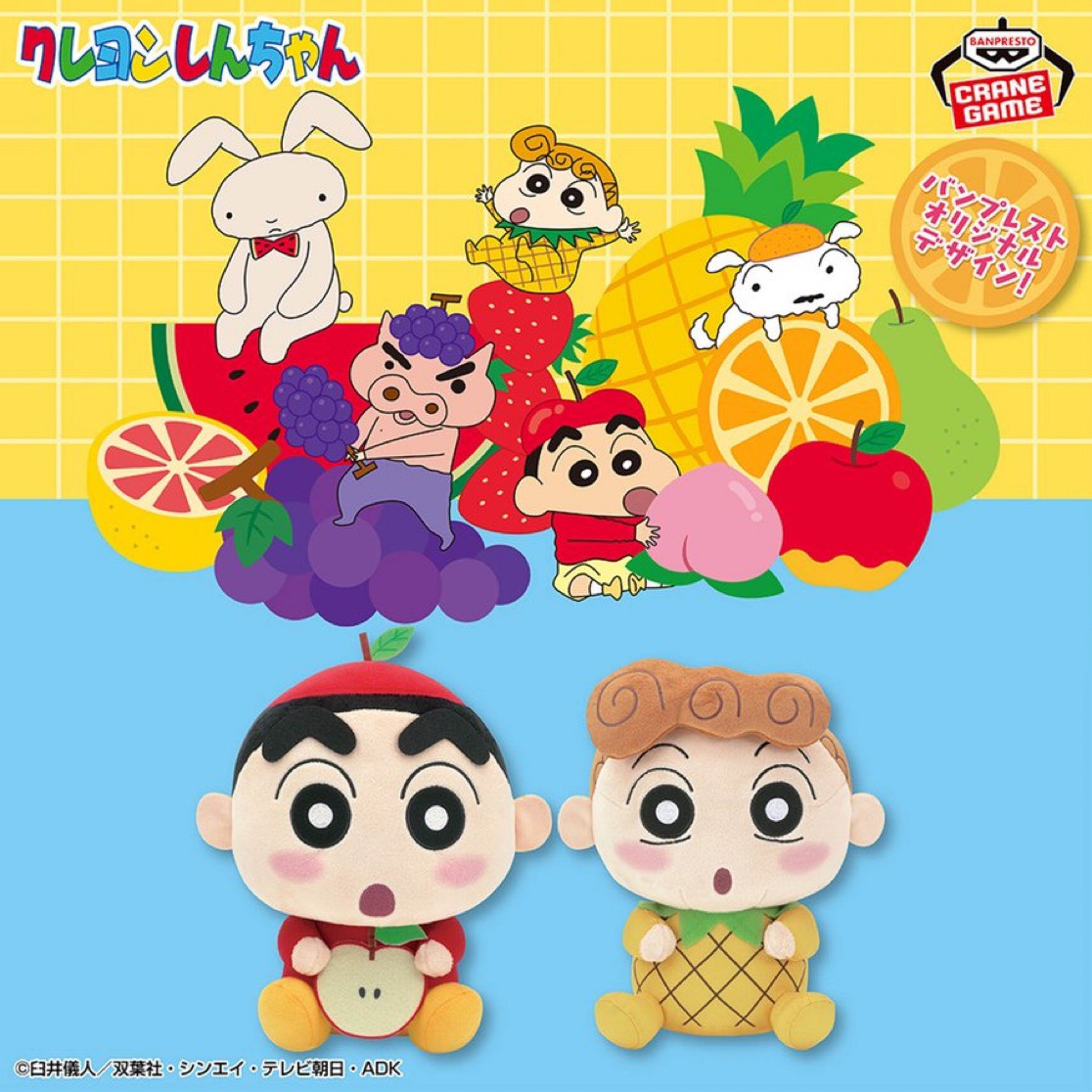 しんちゃんはリンゴ、ひまわりはパイナップルとかわいいフルーツデザインになったぬいぐるみが登場🍎🍍