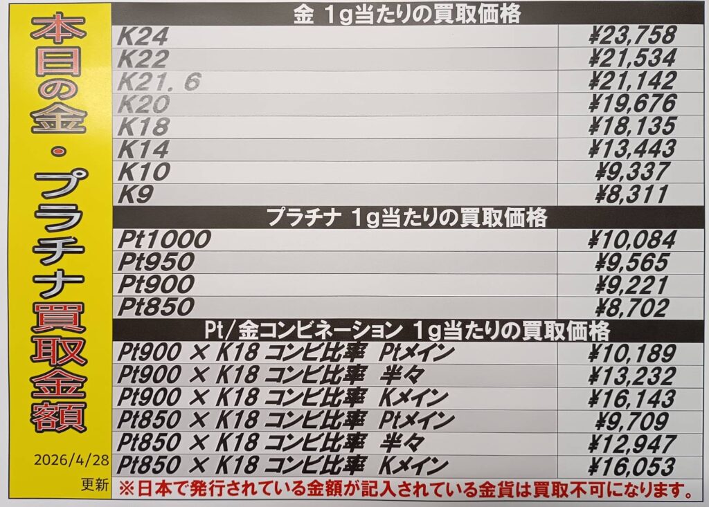 【鹿児島店 換金 買取情報】 金・プラチナ買取価格です。 相場状況により…
