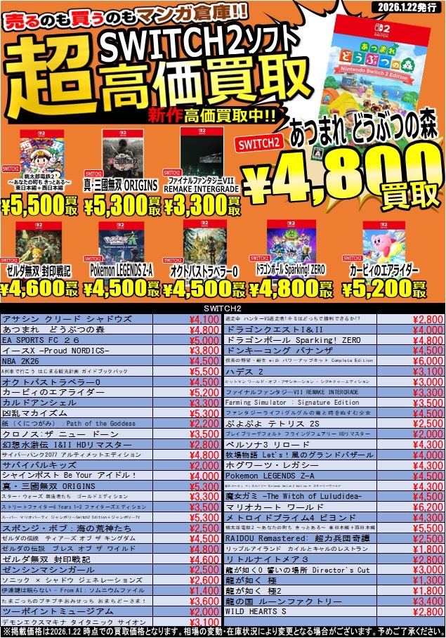 【鹿児島店 ゲーム 買取情報】 買取価格更新しました❗️ Switch・Switch2…