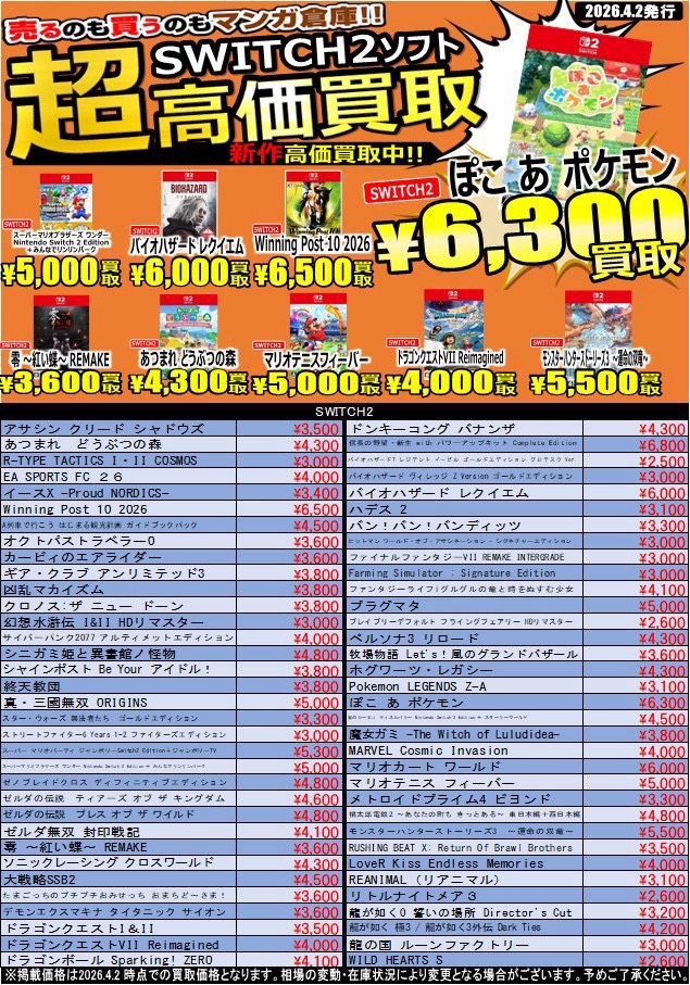 【鹿児島店 ゲーム 買取情報】 買取価格更新しました❗️ Switch・Switch2…