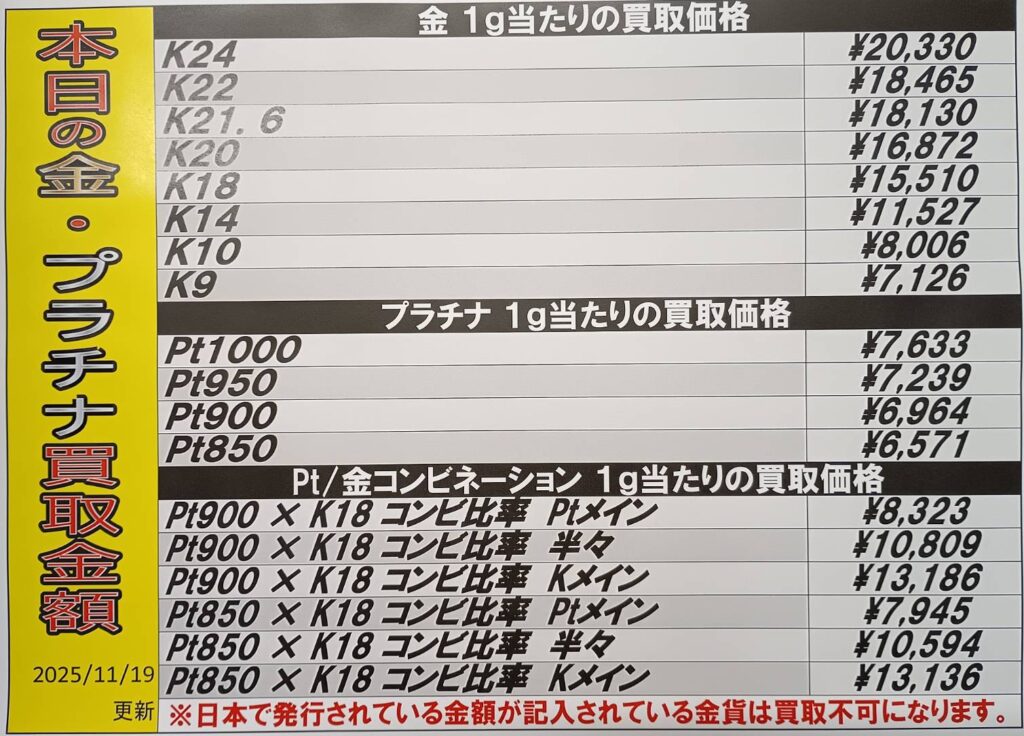 【鹿児島店 換金・酒・携帯他 買取情報】 金・プラチナ買取価格です。 相…